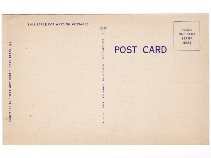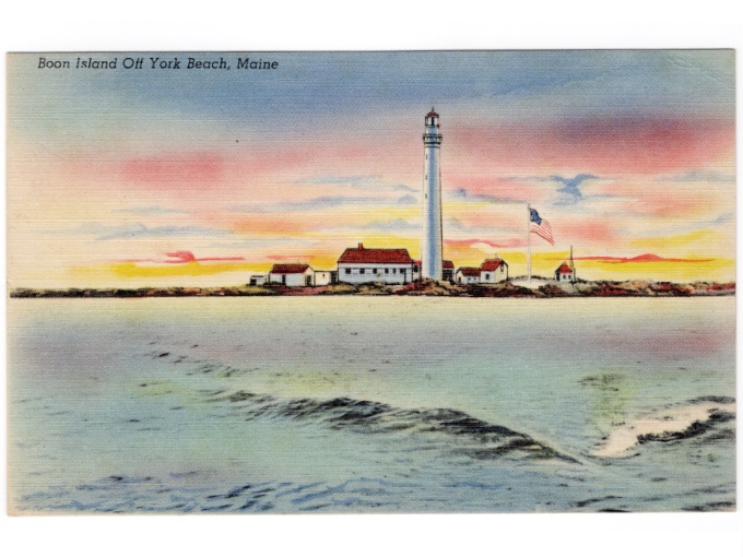 Offshore view of the lighthouse and adjacent buildings on Boon Island. Published by Spar Gift Shop, York Beach, Maine. Colorpicture Publication.