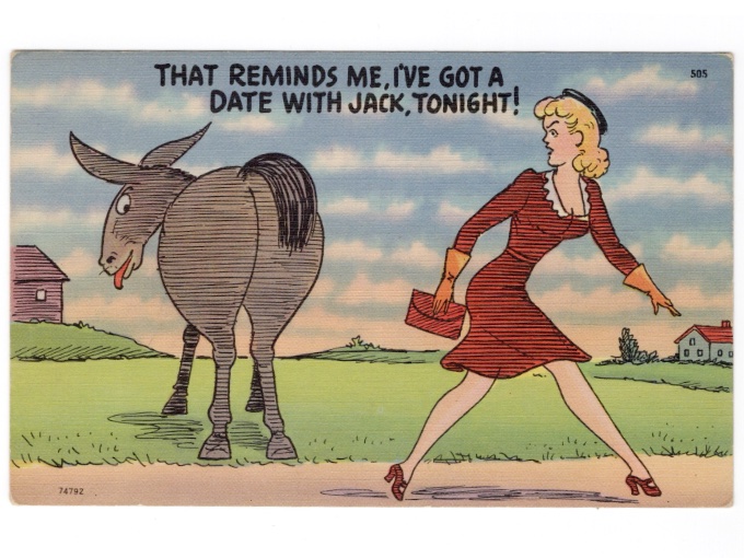 Unused novelty cartoon post card. "That reminds me, I've got a date with Jack, tonight!" Condition is Very Good / Excellent, with no writing, no folds, no holes, never mailed.