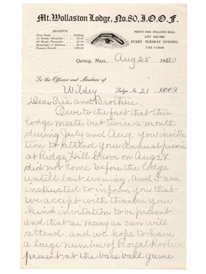 Handwritten letter on Lodge letterhead, to the Officers and Members of the Independent Order of Odd Fellows (IOOF) Lodge No. 80 of Quincy, Massachusetts. Letter written in pencil and dated Aug 25, 1920.