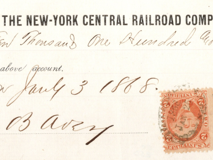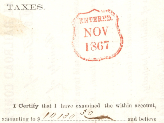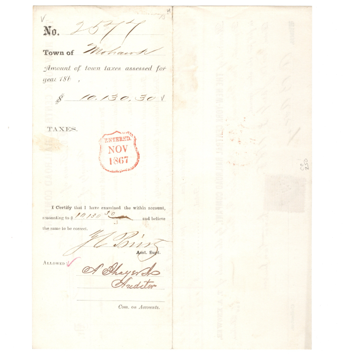 Tax assessment for 1867 totaling $10,130.30 for Mohawk in Herkimer County, New York. Document has a single First Issue 2-cent George Washington Tax Revenue Stamp w/mechanical cancellation date of JAN 25, 1868.