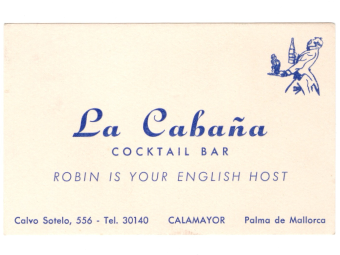 Larger format card advertisement for La Cabaña, denoting "Robin is Your English Host". There is a small illustration of a cocktail serving butler in the upper right corner. Measures 4 1/2" wide by 2 7/8" tall. Condition is Very Good / Excellent with no writing, no folds, no dammage. The back is blank.