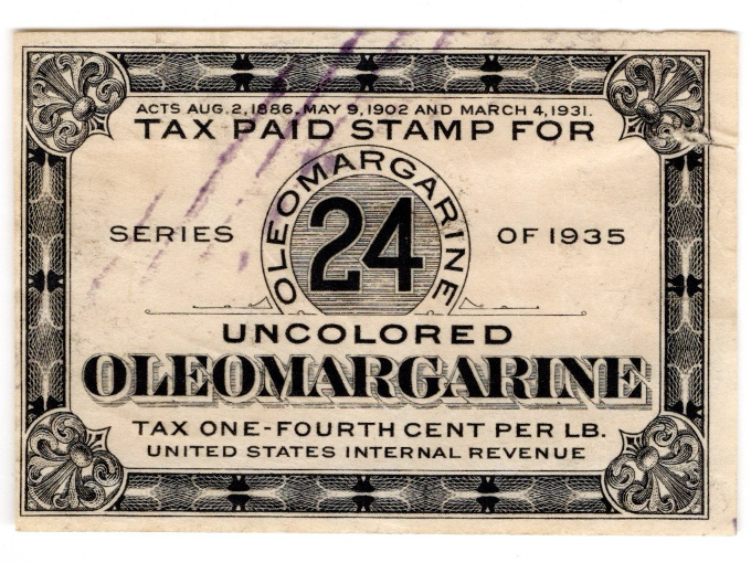 Tax Paid Stamp for Uncolored OleoMargarine. Condition is Fair/Good, with no writing, purple ink marks, some wear, no writing.